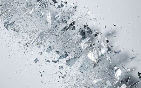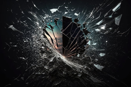 Shards of shattered glass fly through the air against a dark backdrop, capturing the moment of impact and chaos.
