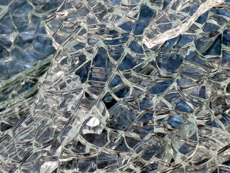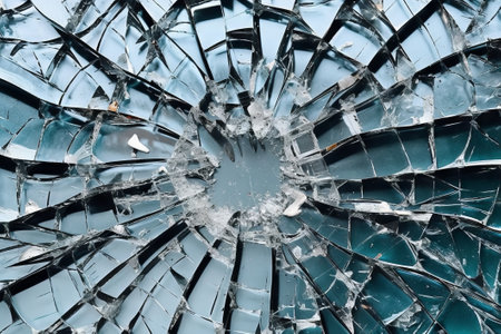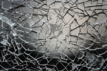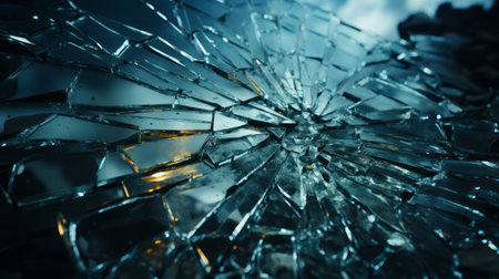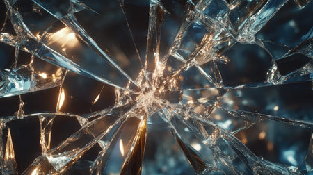 A close-up view of shattered glass showcases a mesmerizing abstract pattern formed by broken shards, reflecting light in an artistic manner.