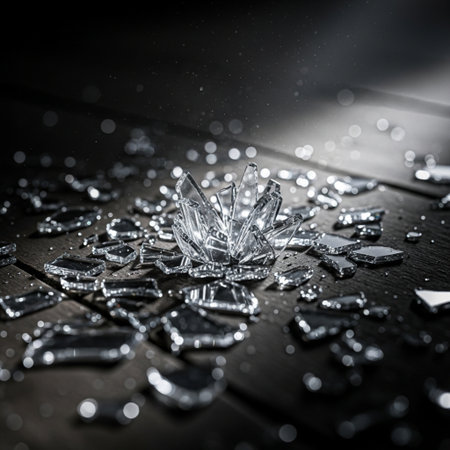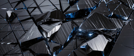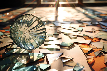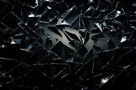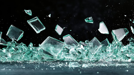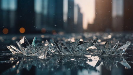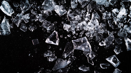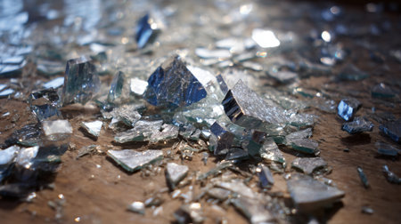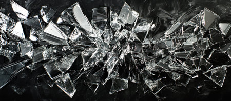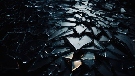 A captivating image of shattered glass fragments scattered across a dark surface, showcasing brilliant reflections and intricate textures in a dramatic composition.