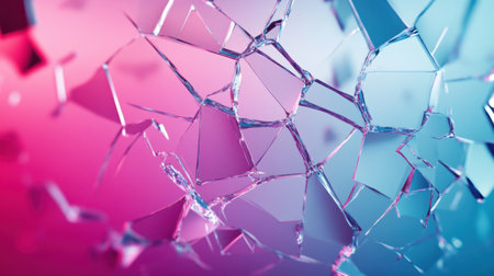 A captivating abstract image showcasing shattered glass with a vibrant pink and blue gradient. The design creates a dynamic visual experience and emphasizes depth.