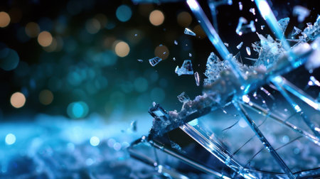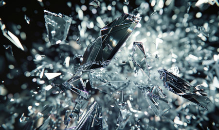 An artistic capture of shattered glass with intricate shards reflecting light against a bokeh background, creating a mesmerizing abstract artwork.