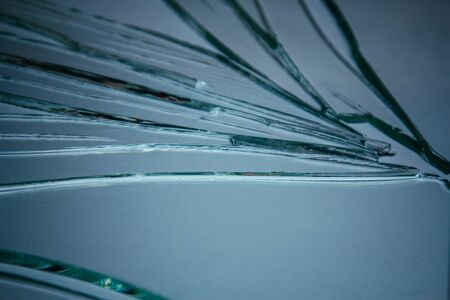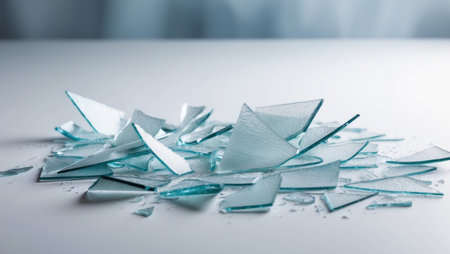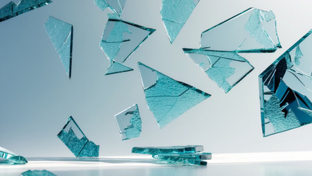 Shattered glass fragments on a light blue background