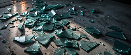 AI Generated. Broken glass pieces on concrete surface in shadowed light for urban design