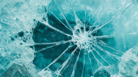 Broken glass showing radial cracks and shattered pieces in teal color