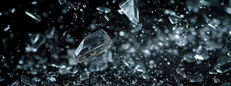 Shattered Glass Pieces Scattered in Air - Dramatic Macro Shot of Breaking Transparent Crystals on Dark Background