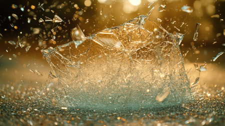 Clear glass shatters as water splashes around, capturing the moment of impact and chaos.