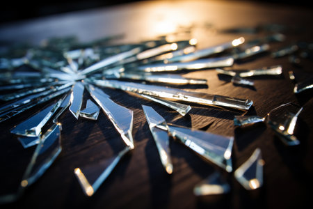 Cracked and shattered mirror glass with sharp shards reflecting fragments of light, dramatic mood.