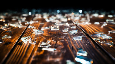 Tiny shards of glass are scattered across a dark wooden floor, glimmering softly in low light. The artistic arrangement creates an enchanting contrast between fragility and strength.