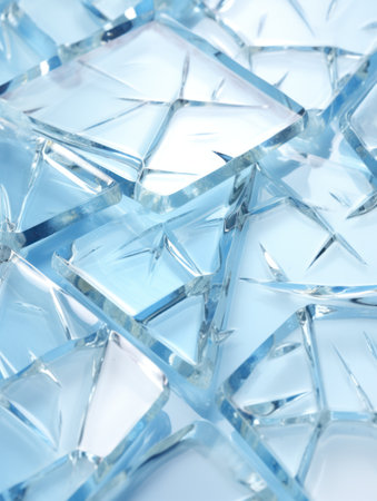 A striking close-up of shattered blue glass pieces showcases intricate textures and reflections. This vibrant abstract image is perfect for creative designs and backgrounds.