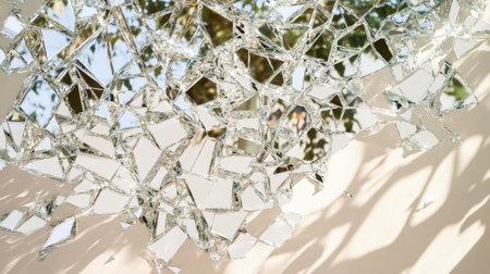 This striking image showcases shattered glass pieces reflecting natural light and greenery, creating an artistic and abstract pattern filled with intricate details.