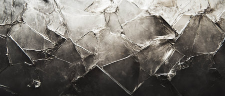Cracked glass texture showcasing sharp fragments and shattered appearance in monochrome tones