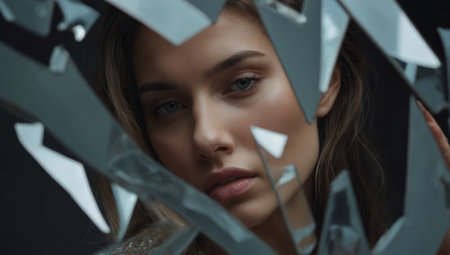 A close-up view captures the fragmented reflection of a womans face in the sharp shards of a broken mirror, creating a compelling and slightly unsettling visual effect. The cracks in the mirror add a dramatic texture to the scene, emphasizing the shattered glass around her serene expression.