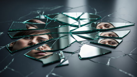 Close-up of a woman's face reflected in two pieces of a shattered mirror, creating a fragmented and emotional portrait. Soft lighting highlights the delicate features and the broken glass.