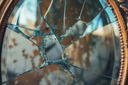Broken antique mirror, shattered reflection, out of focus background