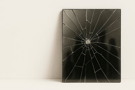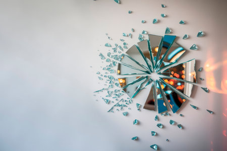 A broken mirror with shards on the wall. Space for text