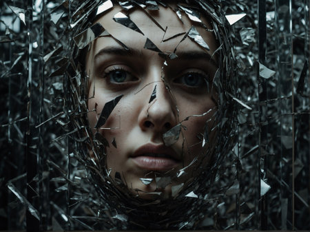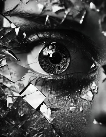 Shattered glass reflects a fragmented and expressive face highlighting emotions and intricate details of a gaze. Generative AI