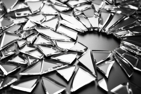 A close-up of a round shattered mirror with fragmented pieces reflecting light on a dark surface. This artistic image captures a unique texture and modern elegance.