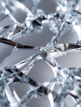 A close-up view of shattered glass showcasing intricate cracks and glimmering highlights. The abstract background enhances the striking depth and detail.