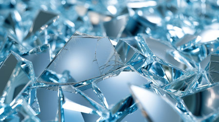 This image showcases an intricate arrangement of shattered glass pieces, reflecting vibrant blue and purple tones, perfect for various creative projects.