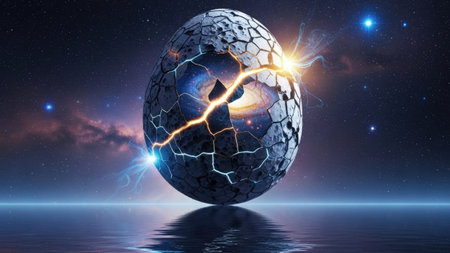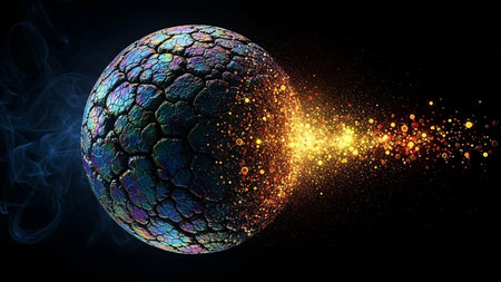 Cracked planet in a vibrant nebula, showcasing a shattered sphere with glowing fissures in space