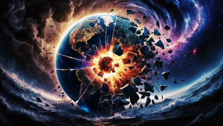 A stunning digital illustration captures Earth amidst a catastrophic asteroid impact, showcasing the chaos of space debris and the majestic view of the planet.