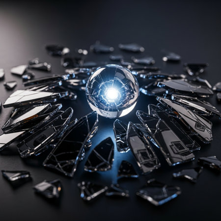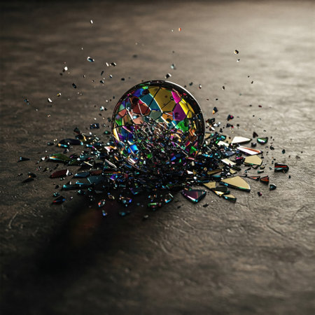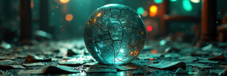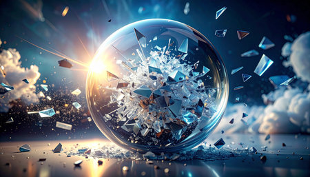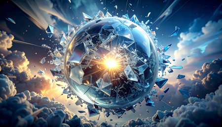 A crystal clear sphere, representing an old idea or a fragile reality, shatters in a dramatic explosion of light and fragments.