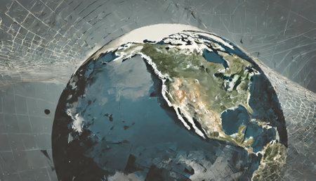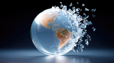 A closeup of shattered glass globe, showcasing continents and fragments of glass. image evokes sense of fragility and impact of change on our planet