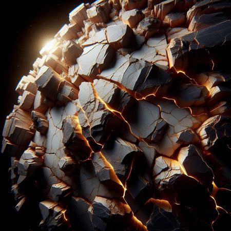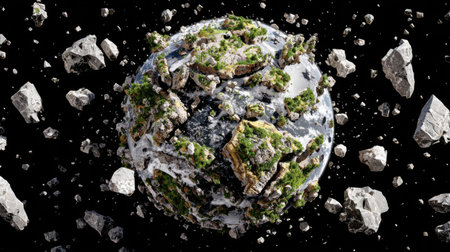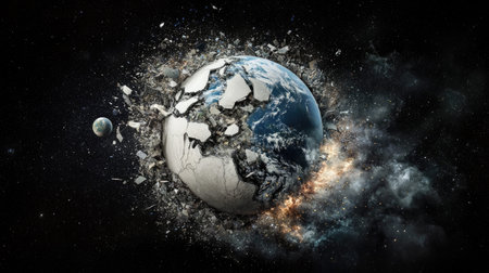 A dramatic visual representation of the Earth breaking apart, with detailed textures of rocks and debris. This striking image evokes themes of environmental crisis and geological change.