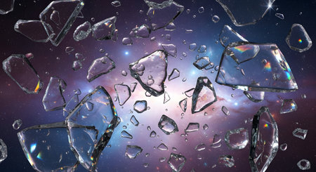 Shattered glass fragments floating against space background Conceptual abstract art portraying cosmic debris and visual fragmentation. Illustrative art depicting shattered reality and otherworldly imagery. AI Generative AI generated