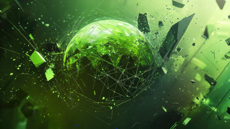 This abstract image features a green planet surrounded by geometric shapes and dynamic elements, creating a vibrant and futuristic visual experience.