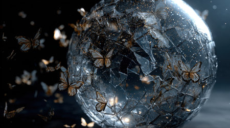 This striking image features a beautifully shattered glass sphere surrounded by delicate butterflies, symbolizing transformation and freedom. The contrast between the fragile glass and vibrant butterflies creates a captivating visual narrative.