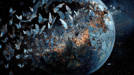 A surreal depiction of delicate butterflies soaring through a shattered view of Earth, capturing themes of beauty, transformation, and freedom at dawn.