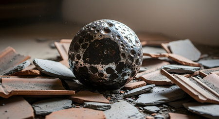 A heavy pitted metal sphere sits among scattered broken terracotta roof tiles and debris. The scene suggests destruction or the aftermath of an impact with cinematic lighting emphasizing the textures.