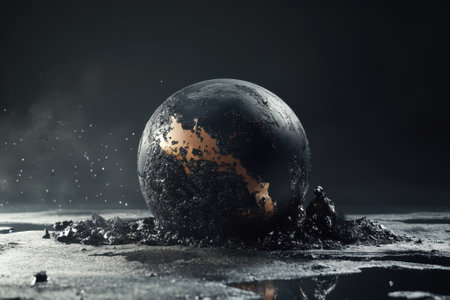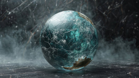 A globe is breaking apart, with fragments falling away to expose its interior. This striking imagery signifies geological changes and the fragility of our planet.