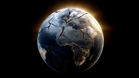 This striking image features a cracked globe with a fractured surface, showcasing the ongoing environmental crisis and the fragility of our planet.