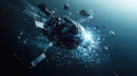 damaged communication satellite drifting in space debris, created with generative ai