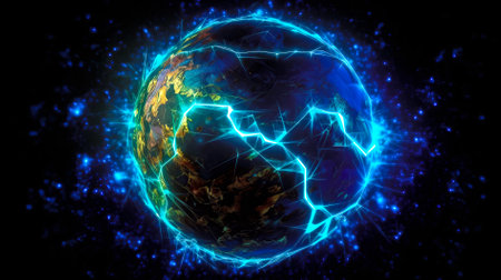 A striking visual of a cracked Earth sphere illuminated by molten lava, set against a dark cosmic background, evoking themes of energy and transformation.