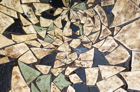 shattered mosaic tiles scattered around a ruin floor