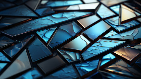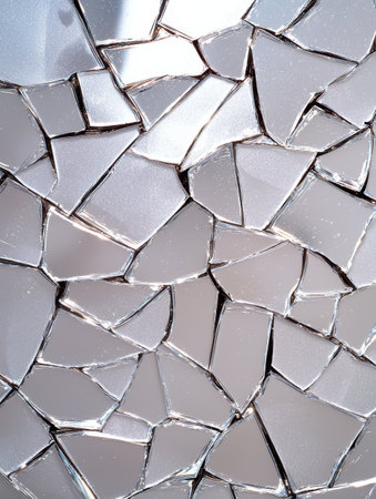 A close-up view of a textured surface featuring broken and cracked mirrors, reflecting light and various shades. The intricate patterns create a visually appealing abstract design.