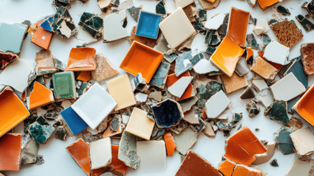 A vibrant collection of shattered ceramic tile fragments in various colors and textures, perfect for artistic projects, design inspiration, and creative displays.