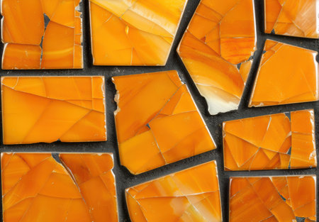 Broken orange tiles arranged in a mosaic pattern, creating an irregular and unique geometric design