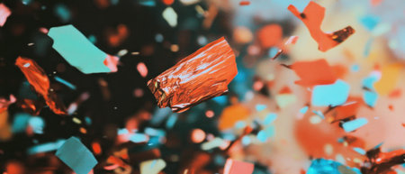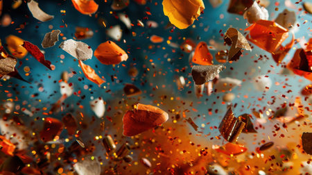 Colorful fragments and particles float air, creating dynamic and vibrant scene. mix of orange, brown, and gold hues evokes sense of energy and movement, reminiscent of autumn leaves and festive