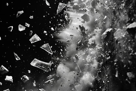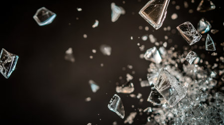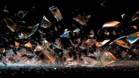 Dynamic image of shattered glass fragments in mid-air against a dark backdrop, highlighting the interplay of light and motion, capturing the essence of fragility and artistic expression.