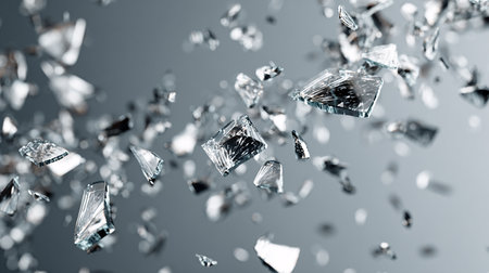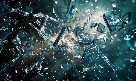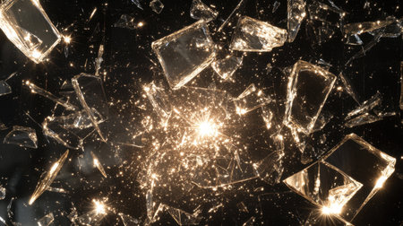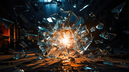 A captivating image of shattered glass fragments creating a dazzling explosion of light and reflections. This artistic composition evokes emotions and captures dynamic energy, perfect for various design projects.