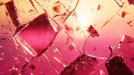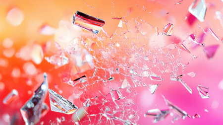 A captivating image of glass shards scattered against a vibrant orange and pink background. The interplay of light creates a dazzling visual effect.