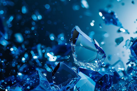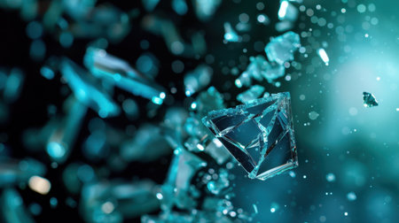A stunning depiction of an aqua crystal fragment shattering into small sparkling pieces, set against a softly illuminated blue background. This mesmerizing image captures the beauty of light and reflections, creating an abstract and elegant visual experience.