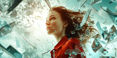 Cracked and shattered mirror glass with sharp shards reflecting fragments of light, dramatic mood.
