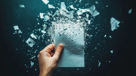 A person expresses frustration by ripping a piece of paper. The dynamic action creates a moment of chaos, capturing the raw emotion and tension of the struggle.