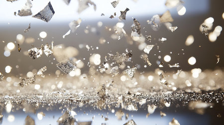 A close-up image capturing shiny confetti falling onto a glossy black surface, illuminated with bright light. This vibrant scene evokes a festive and playful atmosphere, perfect for celebration themes.