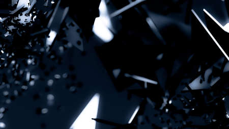 The image features shattered glass fragments suspended against a dark backdrop. The composition highlights sharp edges and reflective surfaces. The lighting is dramatic, suggesting a beam of light. The scene could illustrate disruption, destruction, or abstract concepts for commercial design or editorial purposes.